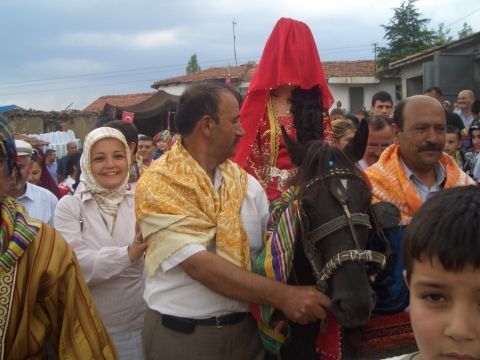 В некоторых местностях Турции у невесты, пока она находится в праздничной повозке, в руках есть большое блюдо. Во время этой церемонии, родственники жениха складывают деньги в это блюдо. После “сбора урожая” мать жениха забирает себе блюдо, а невесту спускают с коня с пожеланиями благополучия и закидывая невесту конфетами, зёрнами пшена, пшеницы, ржи.