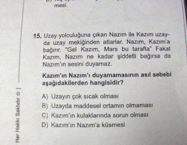 Простые турецкие ребята Назим и Казым отправились в космическое путешествие.Их выпустили в открытый космос. Назим кричит Казыму: «Греби сюда, Казым! Марс в этой стороне!»