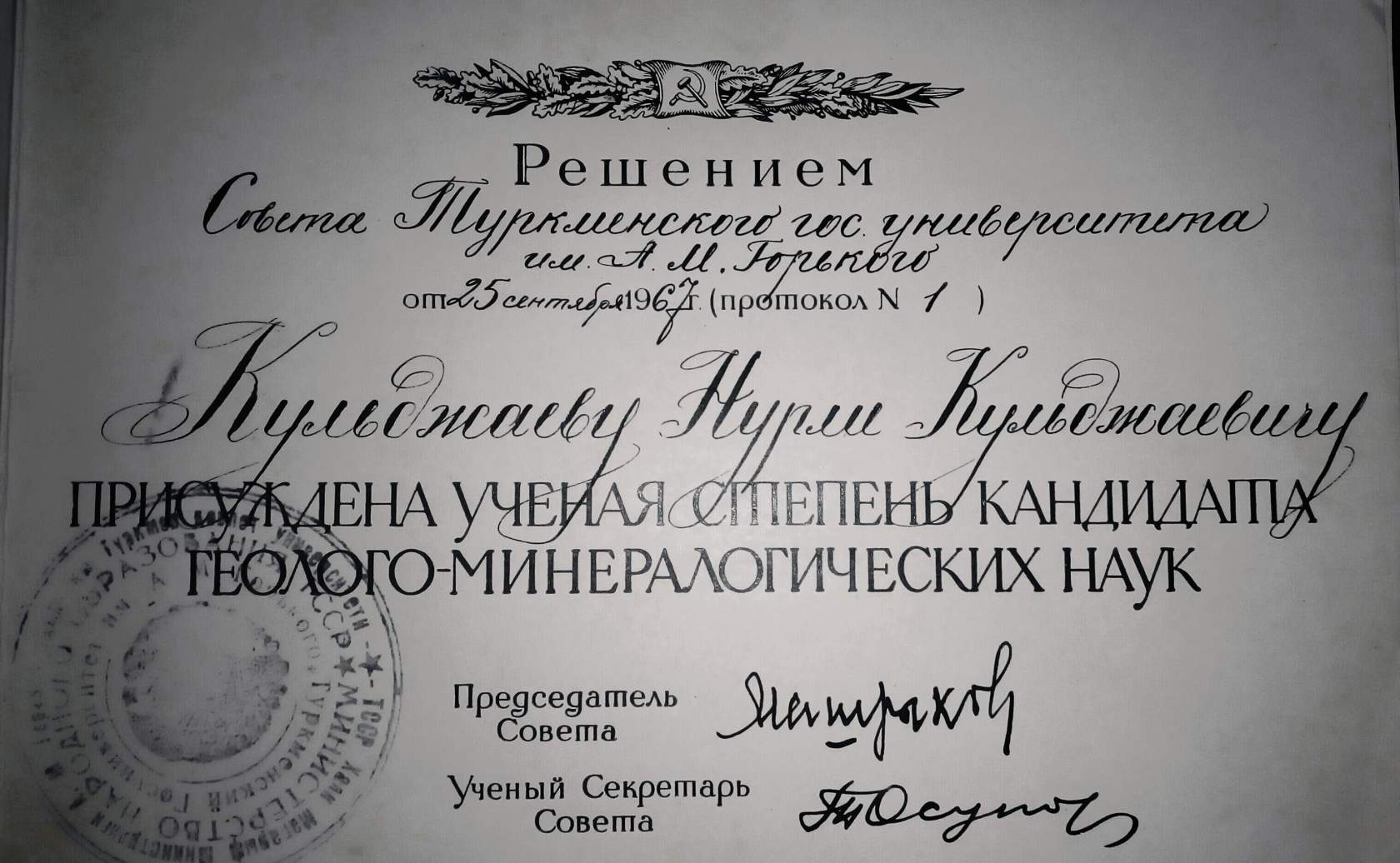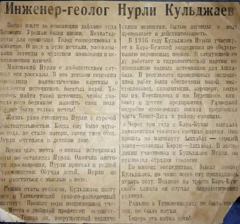 Из газеты(дата, к сожалению, неизвестна), которую прислал внук одного из первых исследователей советского Туркменистана, геолога Кульджаева Нурли Кульджаевича: