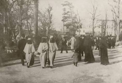 Фотография 1911 года сделана в известном стамбульском парке Гюльхане Gülhane. В то время были установлены правила для прогулок. 4 дня в неделю разрешали гулять мужчинам. Женщинам для прогулок оставляли 3 дня в неделю. Женщины должны были выглядеть именно так.