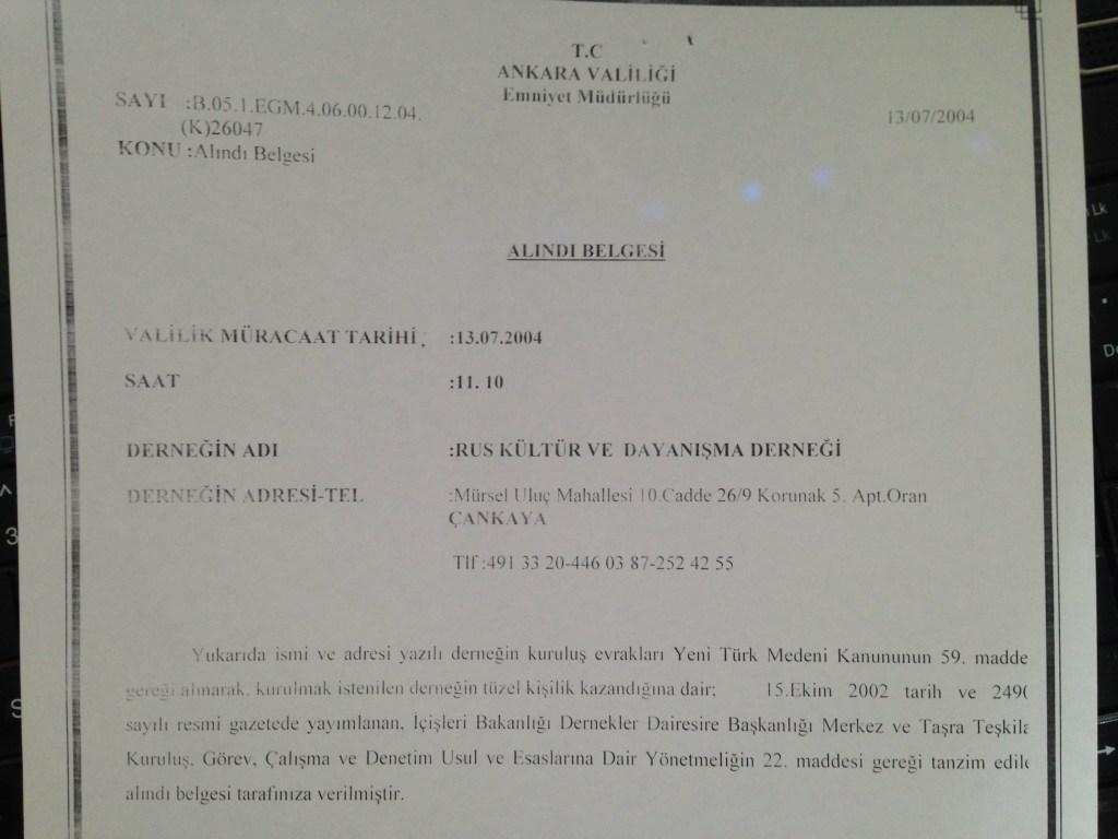 13.07.2004 года группа из нескольких русскоязычных девушек подали документы в губернаторство Анкары на регистрацию первой общественной организации под названием RUS KÜLTÜR VE DAYANIŞMA DERNEĞİ (Общество русской культуры и поддержки русскоязычных). В документе даже указано время 11.10. Решением Губернатора № B054VLK-4060800 от 20.07.2004 Общество обрело свой официальный статус. А письмом № B054VLK-4060100 от 7.08.2004 юридического департамента утверждён устав организации с поправками.