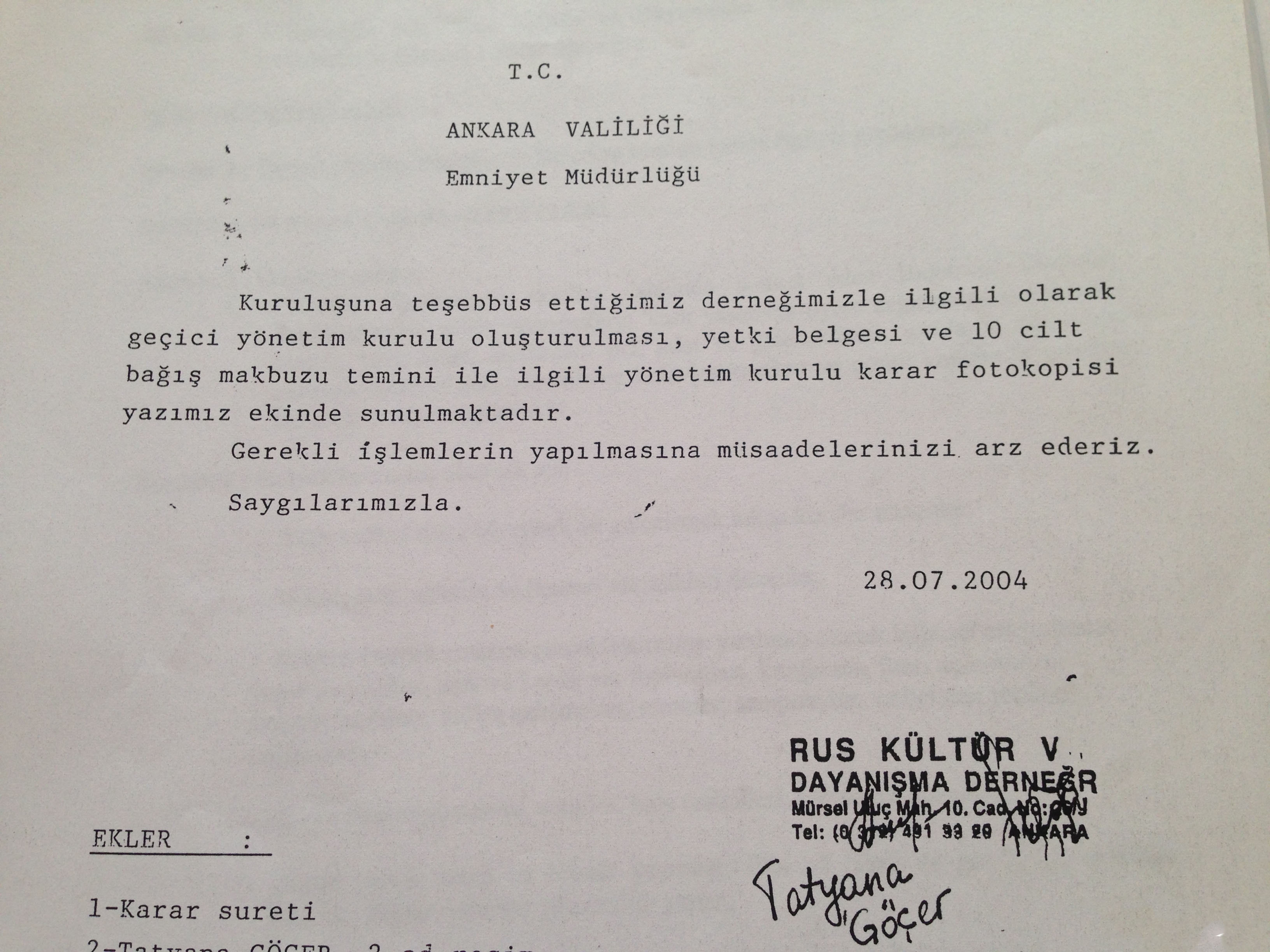 13.07.2004 года группа из нескольких русскоязычных девушек подали документы в губернаторство Анкары на регистрацию первой общественной организации под названием RUS KÜLTÜR VE DAYANIŞMA DERNEĞİ (Общество русской культуры и поддержки русскоязычных). В документе даже указано время 11.10. Решением Губернатора № B054VLK-4060800 от 20.07.2004 Общество обрело свой официальный статус. А письмом № B054VLK-4060100 от 7.08.2004 юридического департамента утверждён устав организации с поправками.
