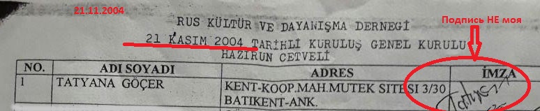 Документ общего собрания RUS KÜLTÜR VE DAYANIŞMA DERNEĞİ, где стоит якобы моя подпись.
